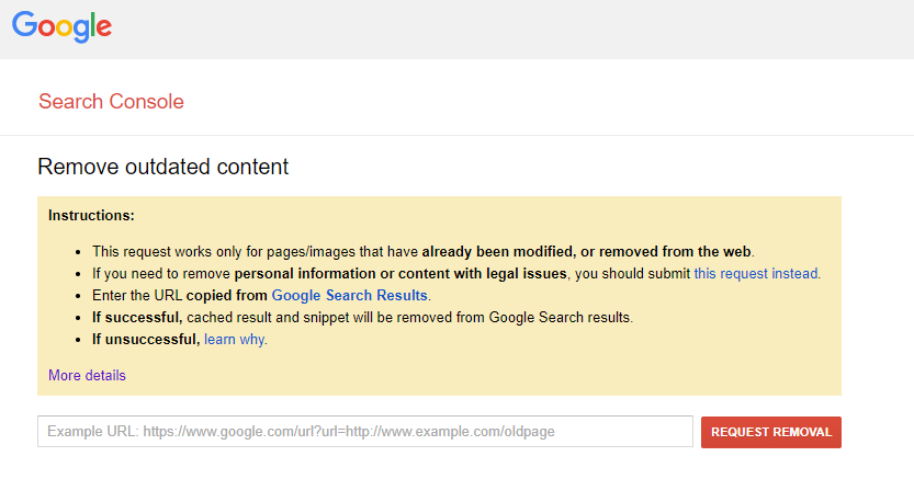Kalau websitenya punya orang lain, atau ada di platform milik orang lain misalnya saja seperti Steller tadi. Pastikan link tersebut sudah HILANG karena kamu menghapusnya, atau meminta Admin web terkait untuk dihapus. Setelah itu kunjungi link removal outdated content ini.